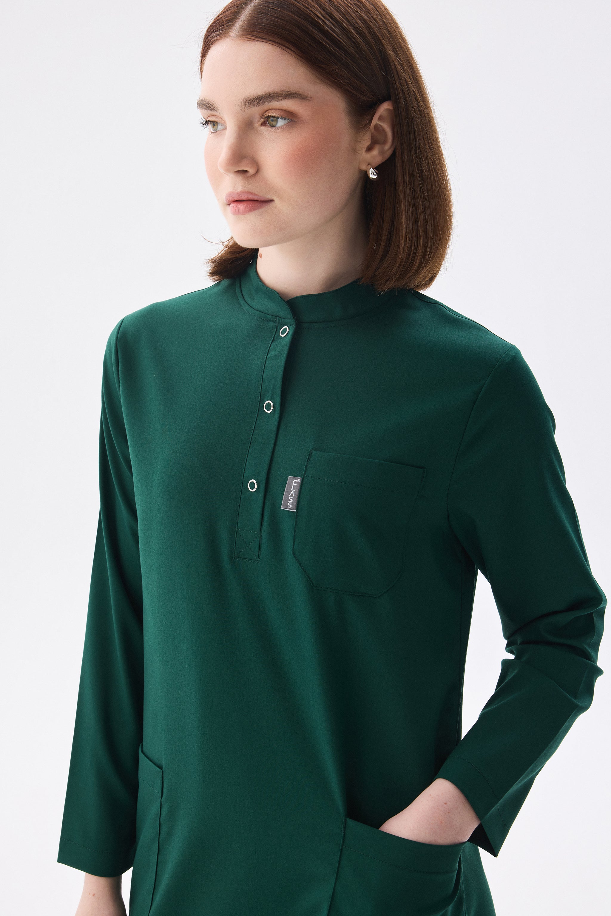 Class Üniforma'nın tesettür hemşire forması, hemşirelerin iş günlerinde ihtiyaç duyduğu konforu ve şıklığı sunmak için özel olarak tasarlanmıştır. Tunik yapıda, hakim yaka ve çıtçıt kapamalı bu forma, hem rahatlık hem de profesyonellik sağlar. Klasik boru kesim hemşire forması tek altıyla kombinlenmiştir, böylece tam bir takım olarak sunulur.