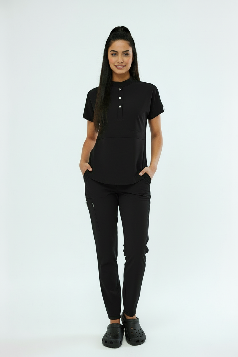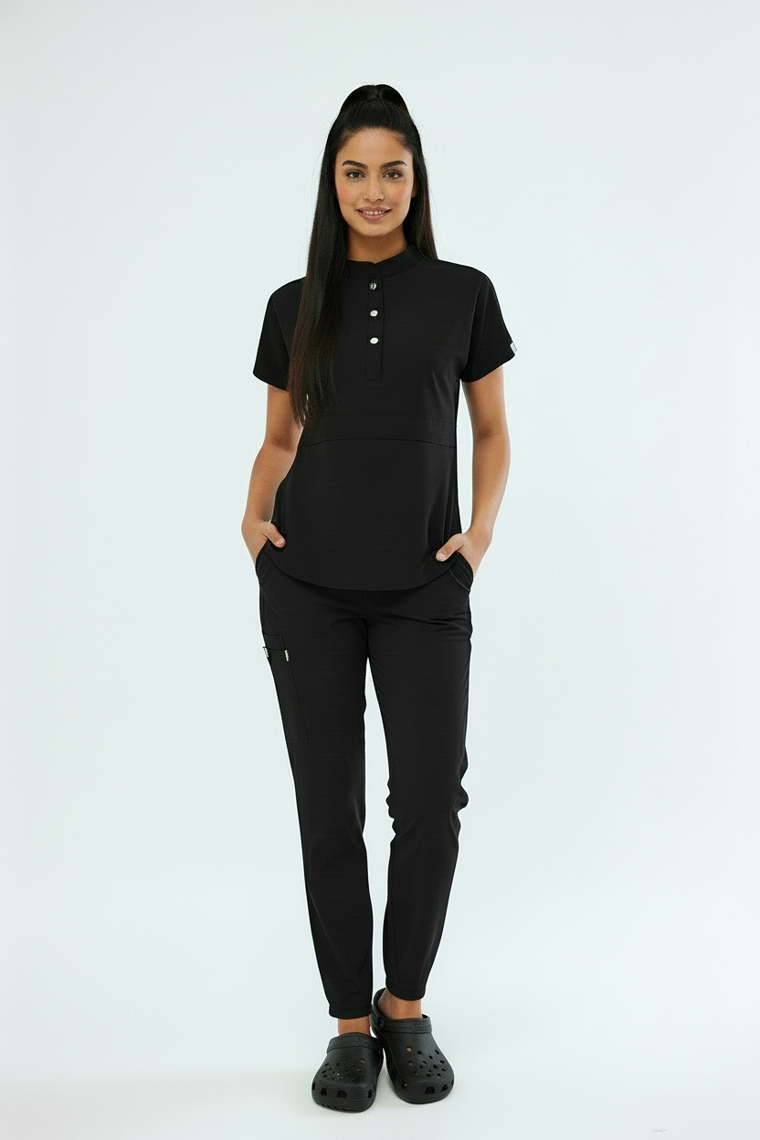 Nova'nın siyah renkli forma takımı, kadın kalıbıyla özel olarak tasarlanmıştır ve likralı kumaştan üretilmiştir. Esnek yapısı sayesinde gün boyu rahatlık sağlar. Ürün görsellerinde yer alan beden tablosuna göz atarak sipariş vermeniz, üniformanın size uygun olmasını sağlar. Nova - Premium Scrubs modelimizde şu anda 5 farklı renk seçeneği bulunmaktadır.