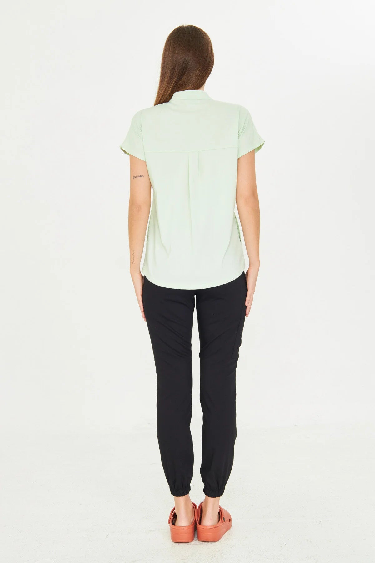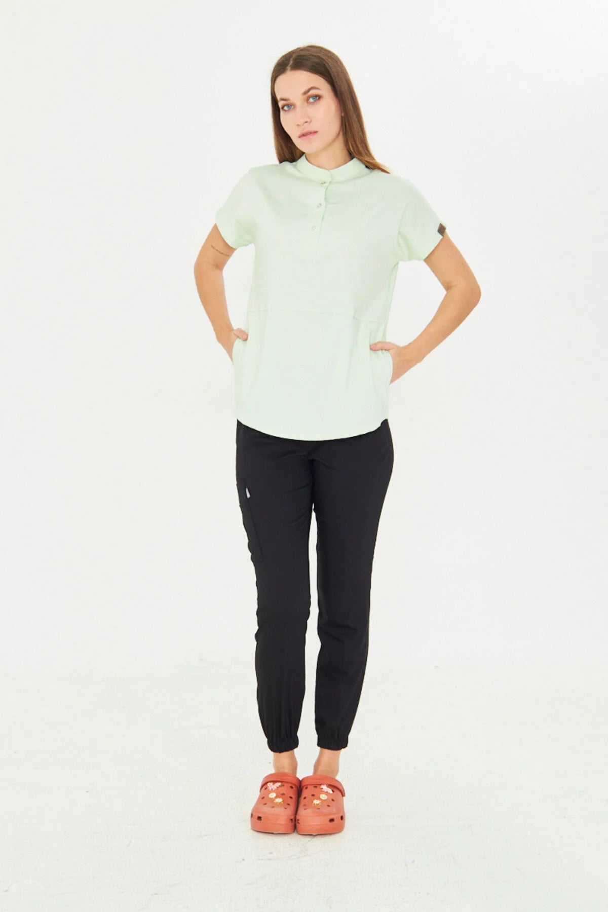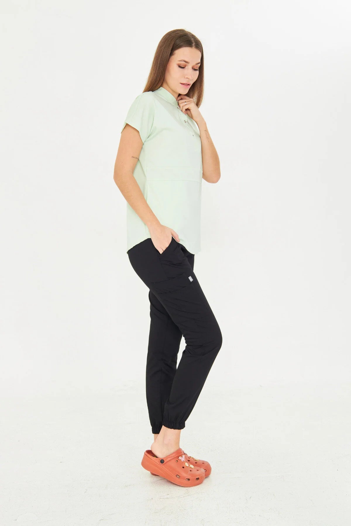 N O V A | Su Yeşili Siyah Kadın Likralı Hakim Yaka Yarım Çıtçıtlı Hemşire Ve Doktor Forması Scrubs