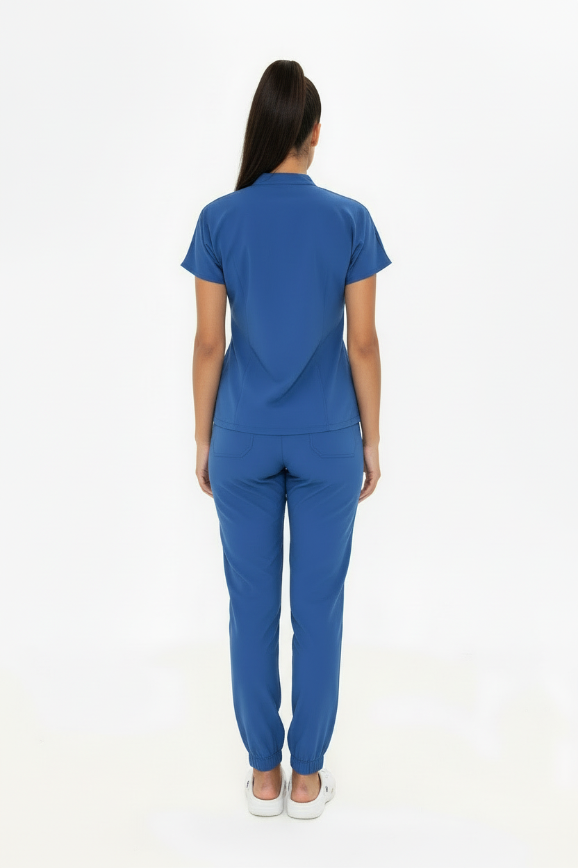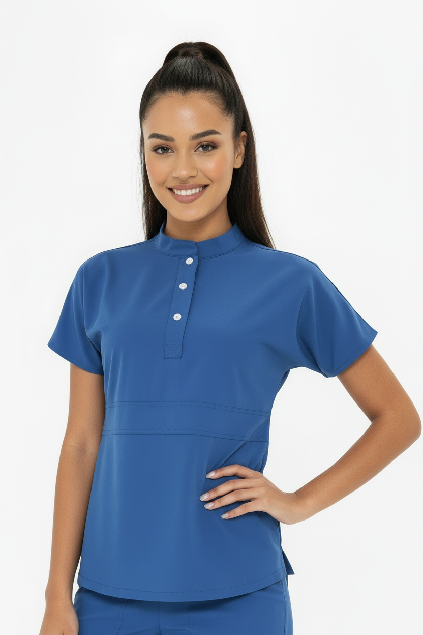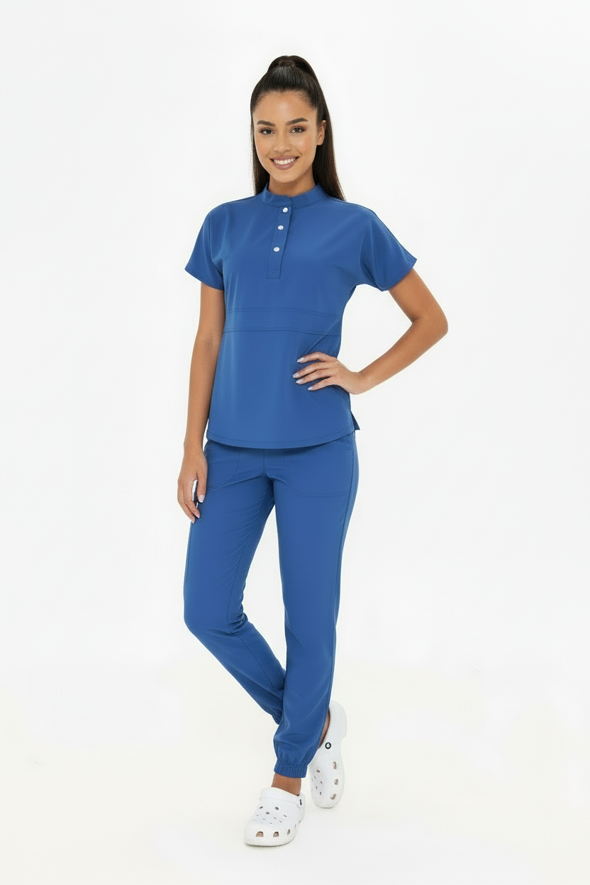 N O V A | Fırtına Mavi Kadın Likralı Hakim Yaka Yarım Pat Çıtçıtlı Hemşire Ve Doktor Forması Scrubs