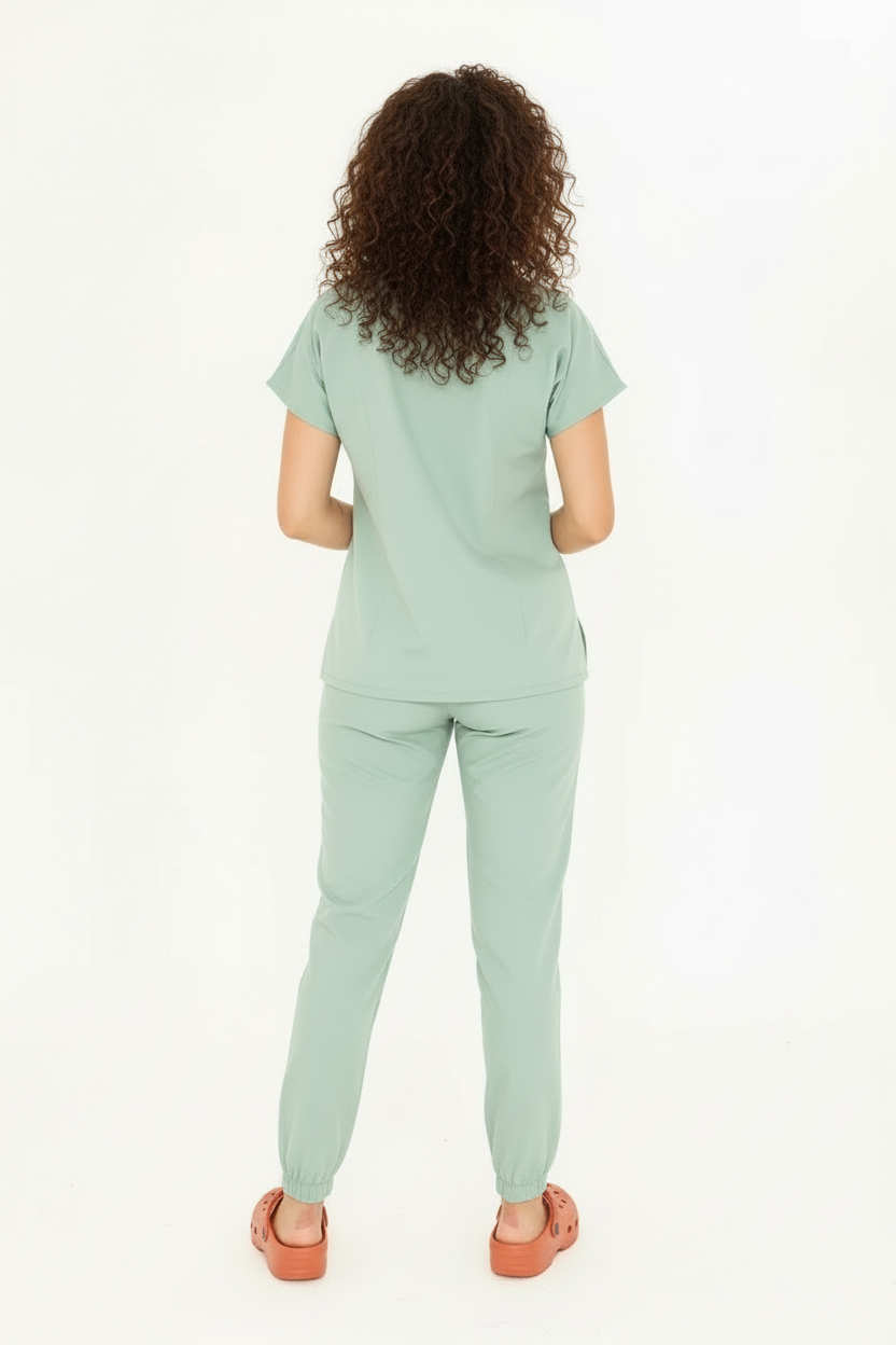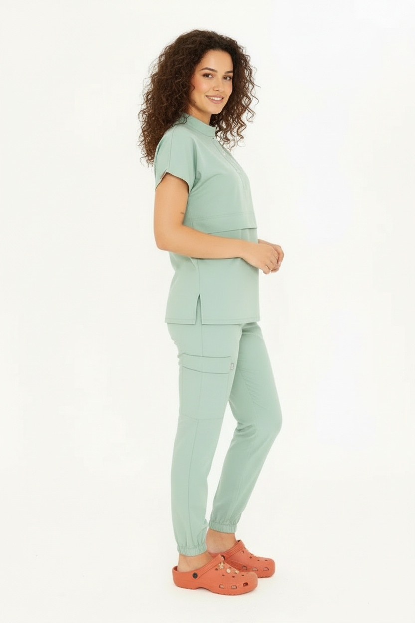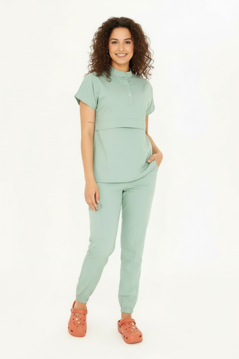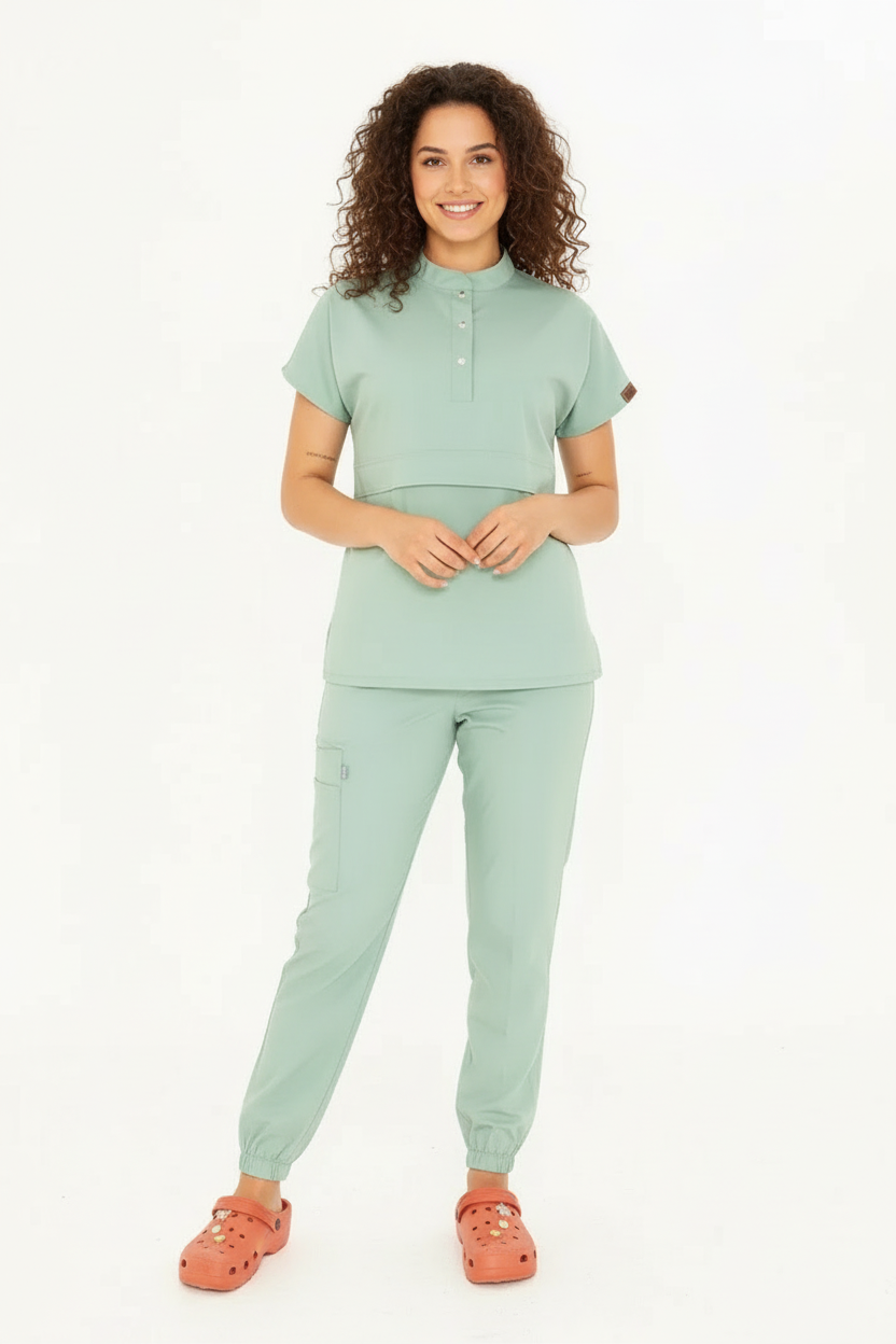 N O V A | Çağla Yeşili Likralı Hakim Yaka Yarım Çıtçıtlı Hemşire Ve Doktor Forması Scrubs