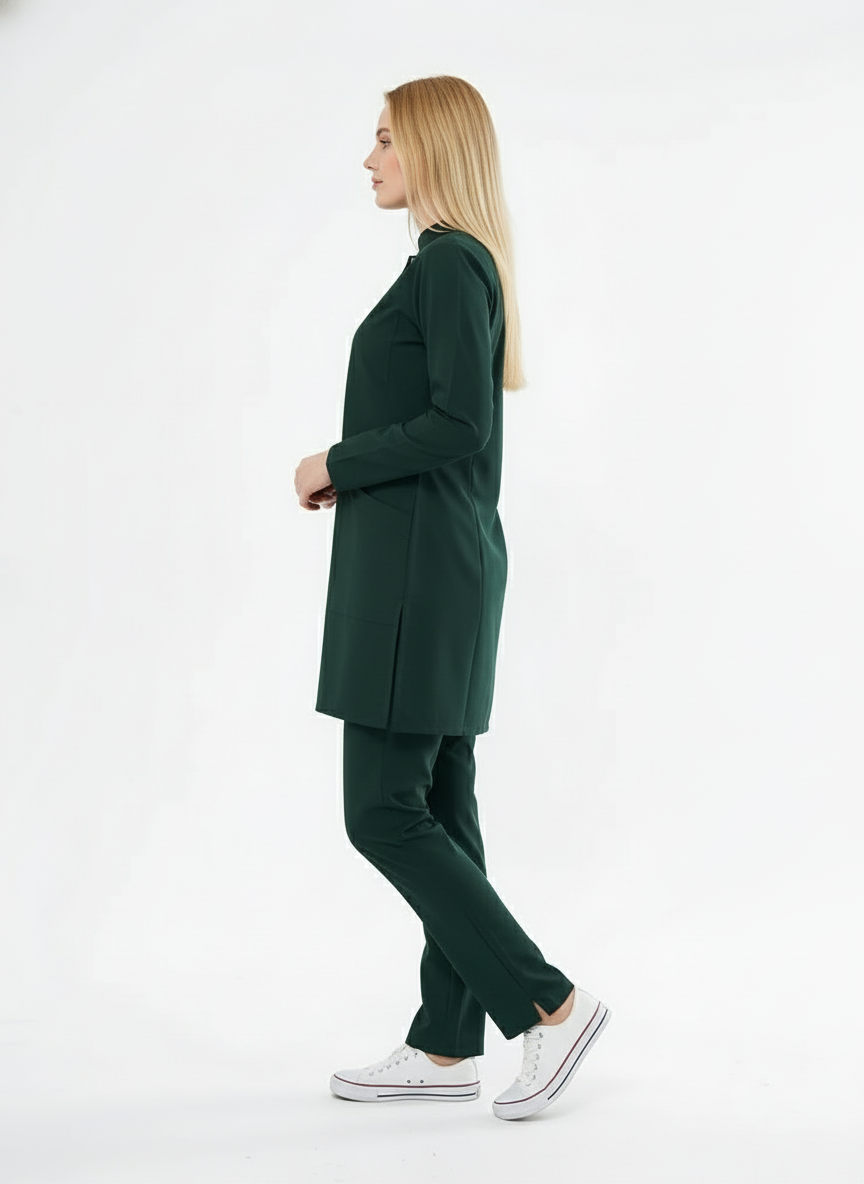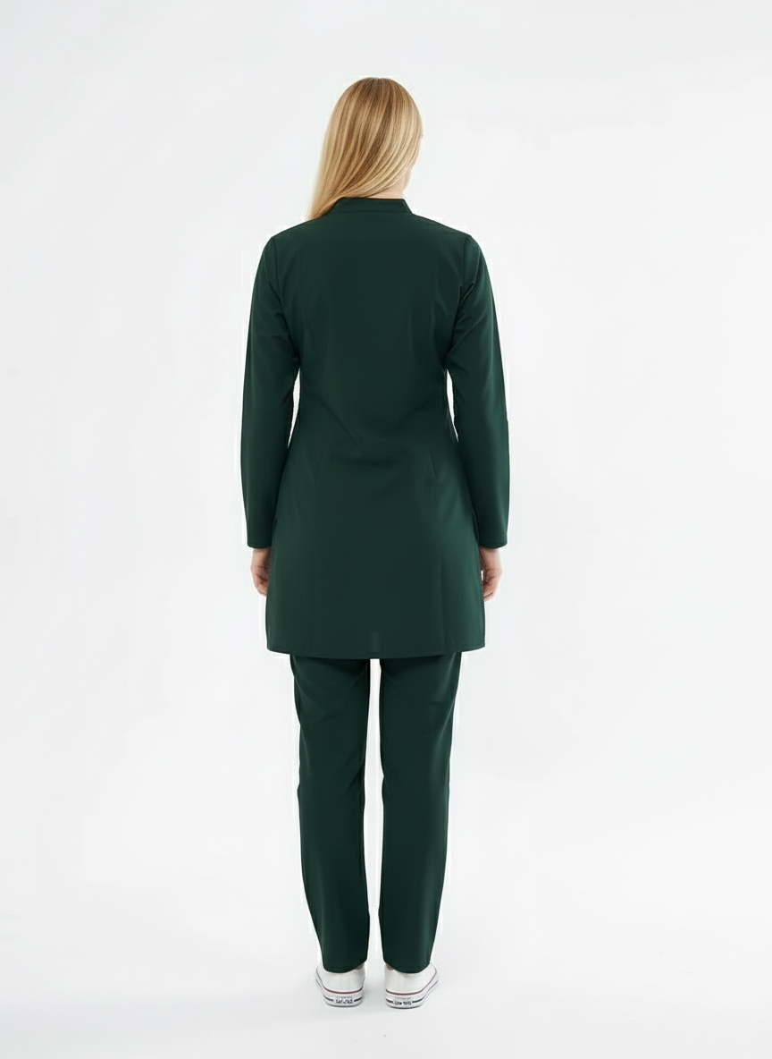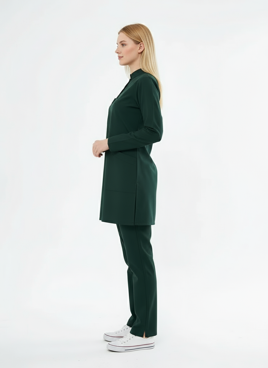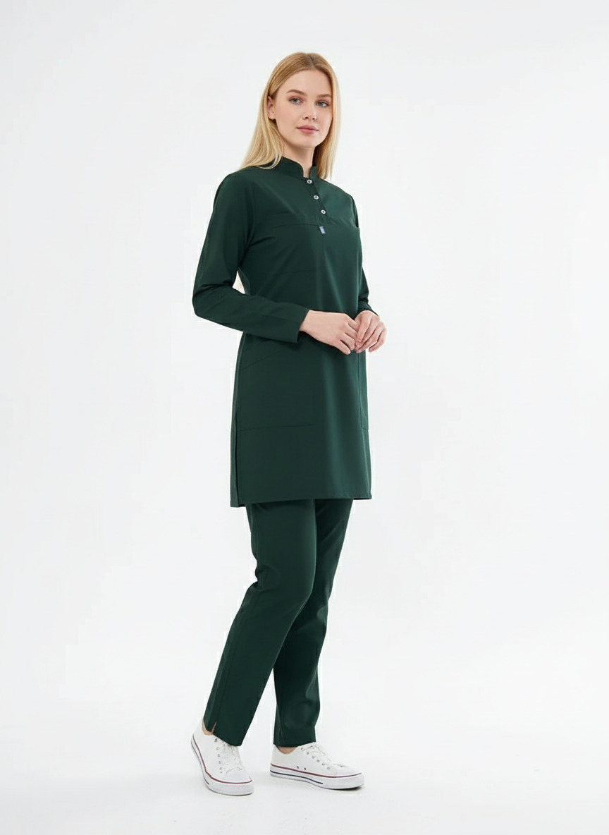 Tesettür - Avcı Yeşili Likralı Hemşire Üniforma Takımı
