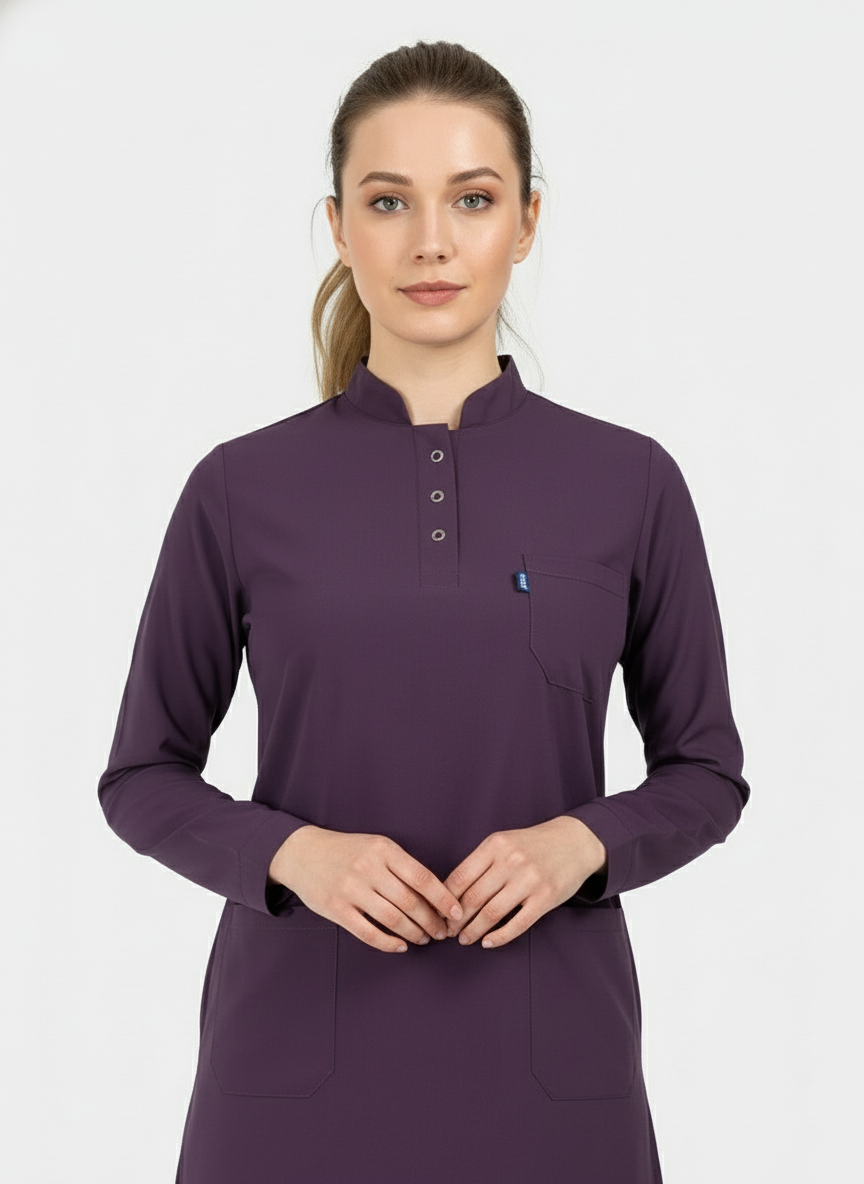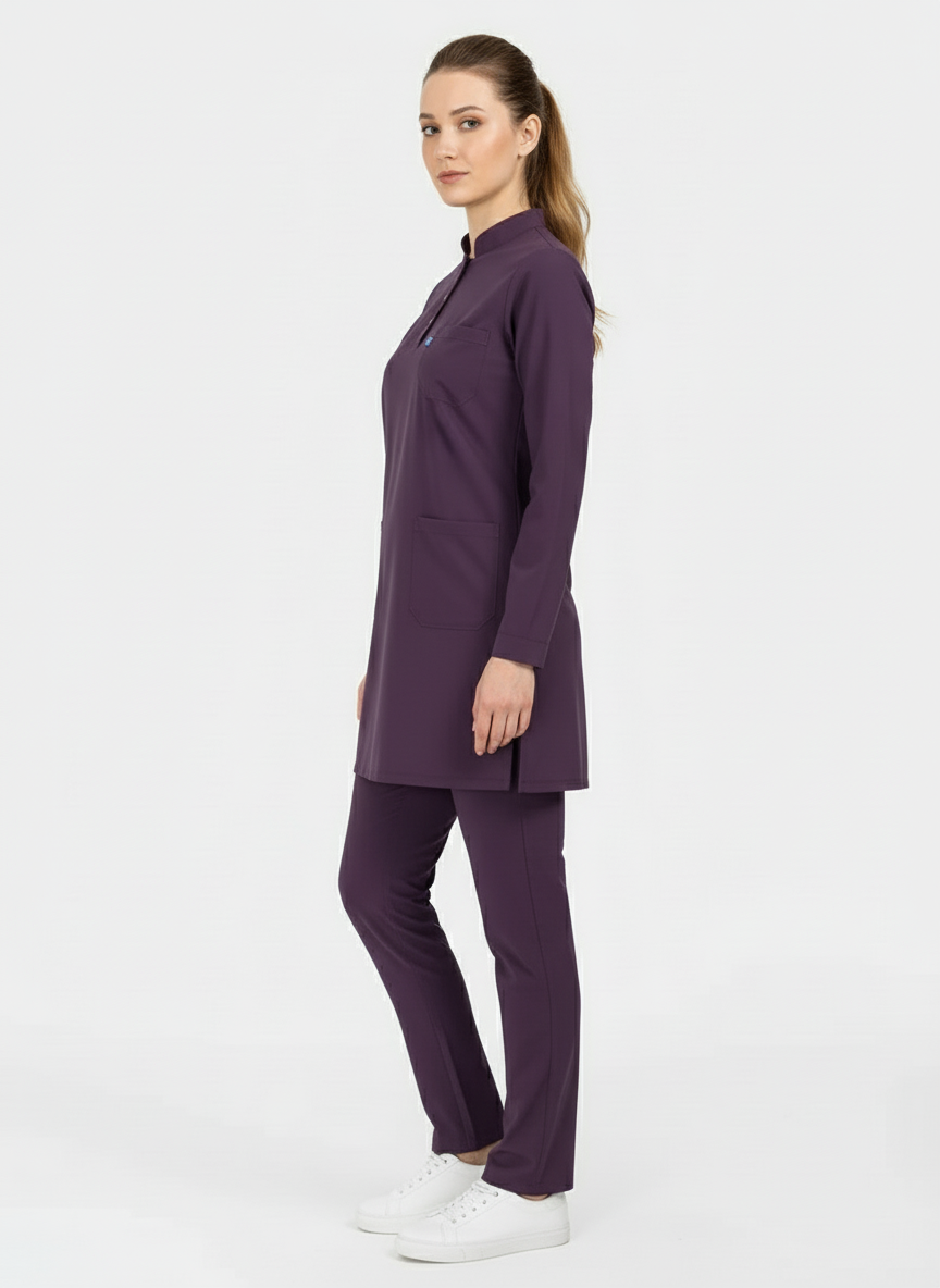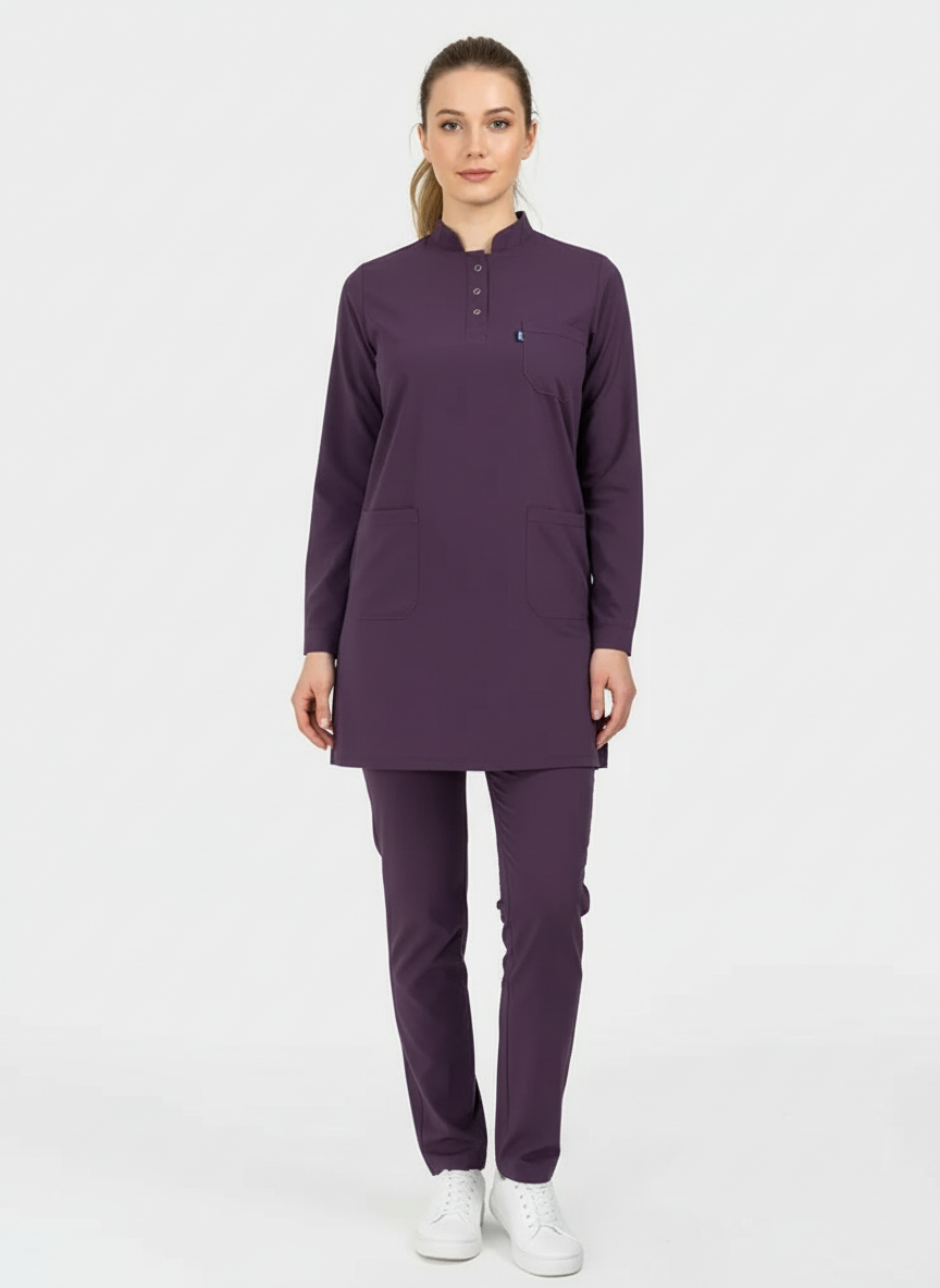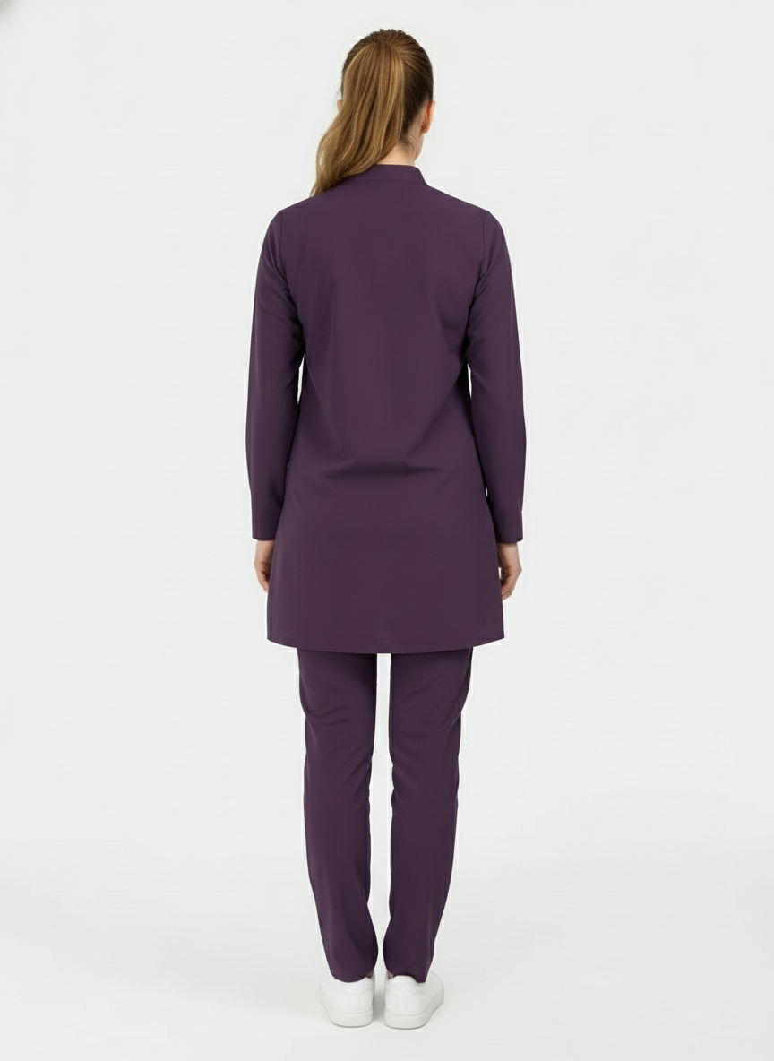 Tesettür - Koyu Mürdüm Likralı Hemşire Üniforma Takımı