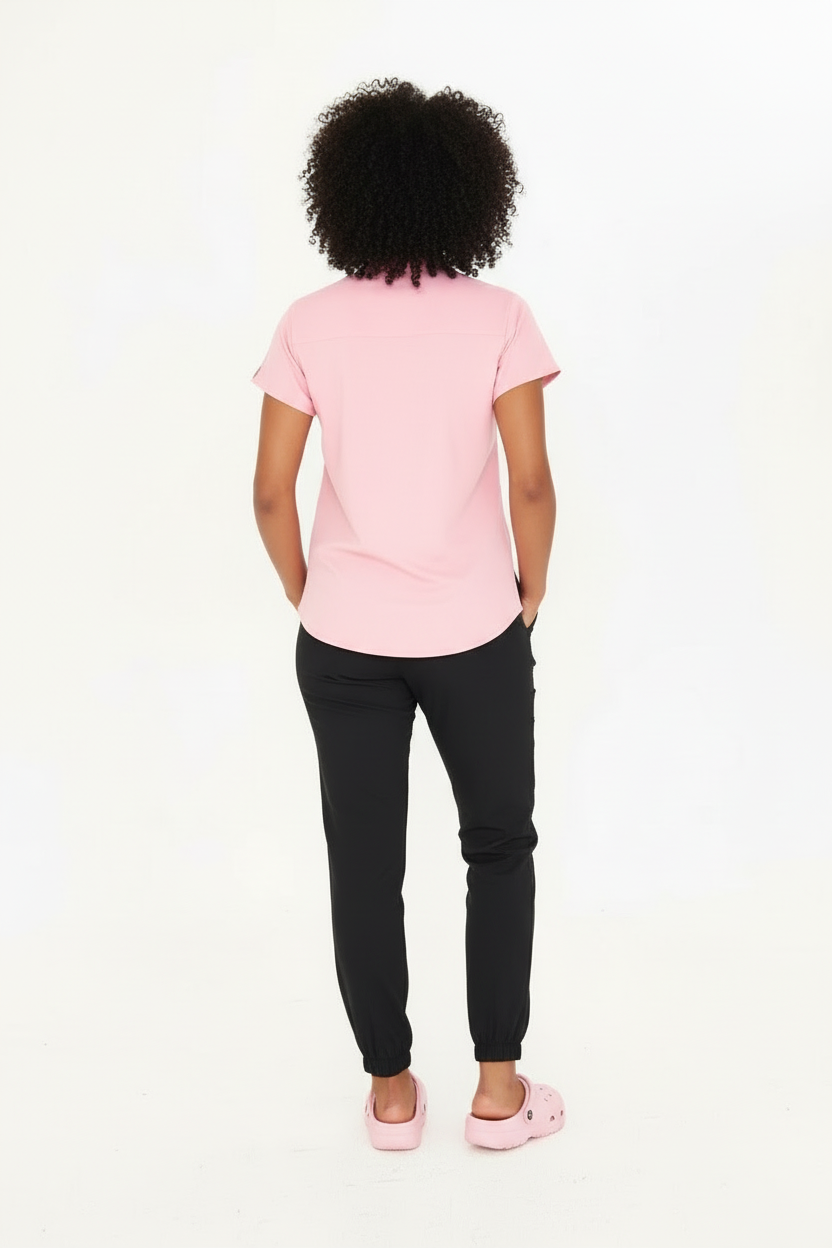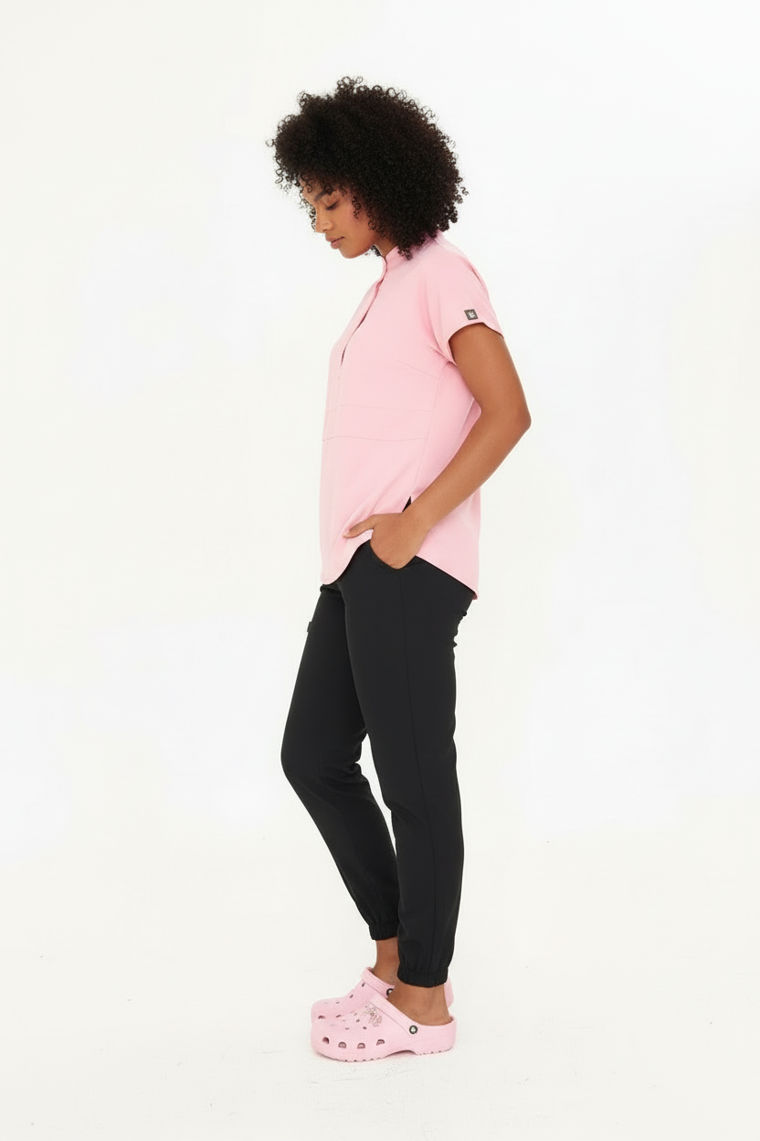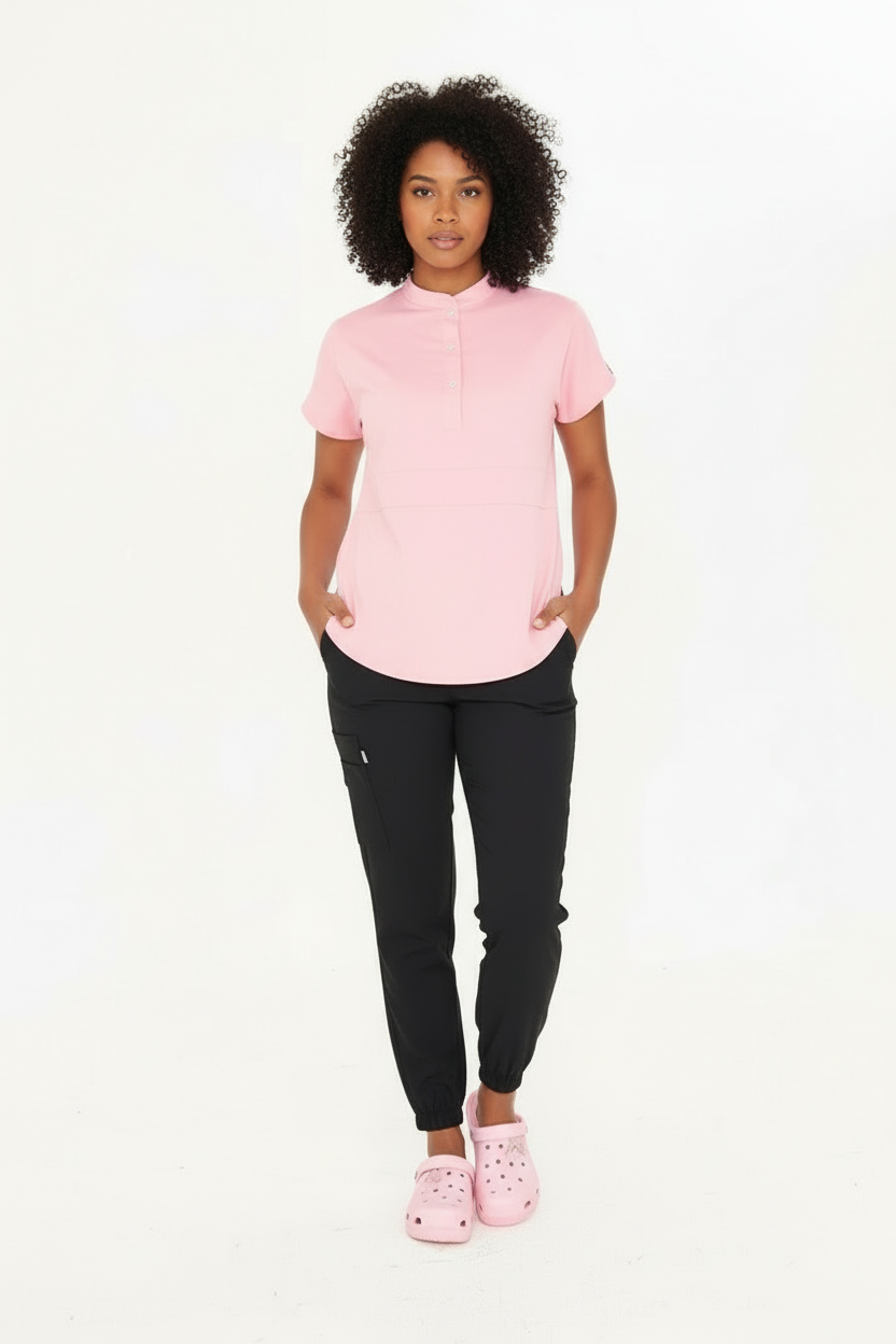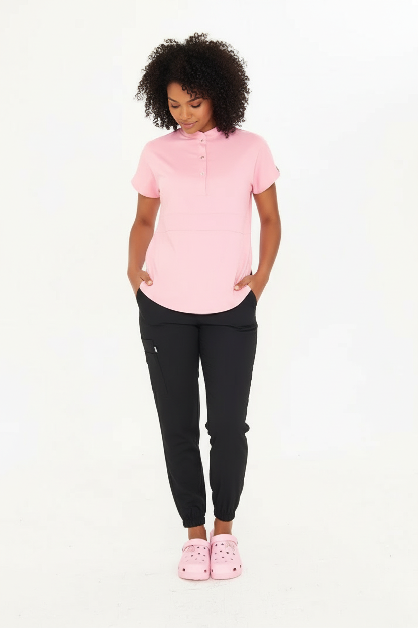 N O V A | Pembe Siyah Kadın Likralı Hakim Yaka Yarım Pat Çıtçıtlı Hemşire Ve Doktor Forması Scrubs